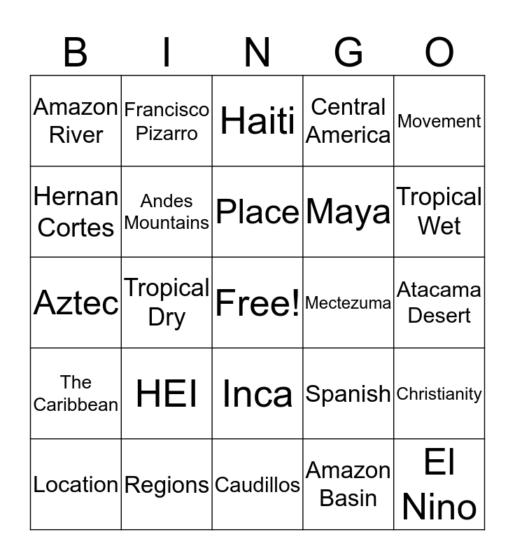This bingo card has a free space and 24 words: HEI, Regions, Place, Location, Movement, Amazon River, Hernan Cortes, Francisco Pizarro, Mectezuma, Inca, Maya, Aztec, Spanish, Christianity, Andes Mountains, Amazon Basin, Atacama Desert, Haiti, Tropical Wet, Tropical Dry, El Nino, The Caribbean, Central America and Caudillos.