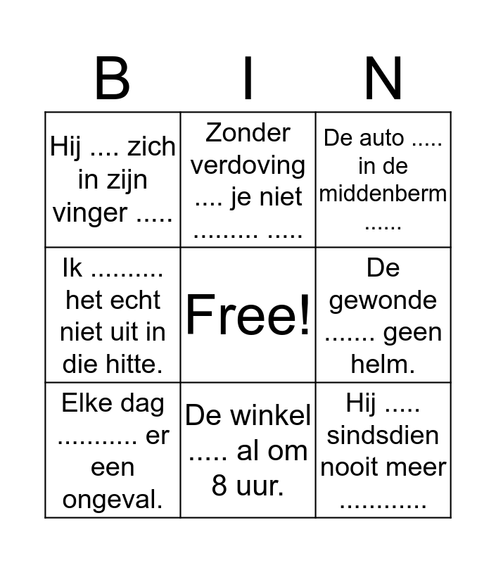 This bingo card has a free space and 14 words: gisteren .... ik laat in bed., mijn telefoonnummer ... ............., Elke dag ........... er een ongeval., Zonder verdoving .... je niet ......... ....., Ik .......... het echt niet uit in die hitte., Hij ..... sindsdien nooit meer ............, Amerigo Vespucci ..... als eerste land., Miljoenen jaren geleden ..... er dinosaurussen rond op Aarde., De winkel ..... al om 8 uur., Hij .... zich in zijn vinger ....., Zonder goede punten ..... hij geen zakgeld., De gewonde ....... geen helm., De auto ..... in de middenberm ...... and We ...... twee tweepersoonskamers .......