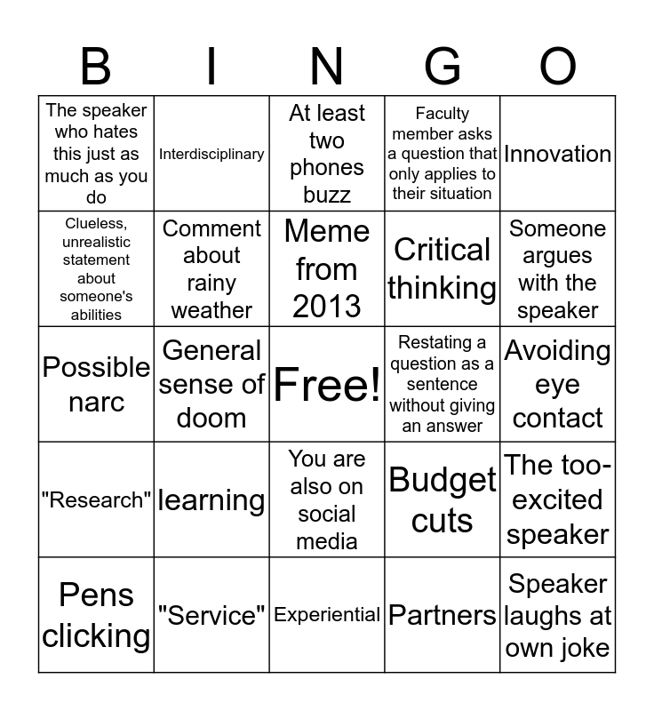 This bingo card has a free space and 51 words: Enrollment is up, Speaker laughs at own joke, Assessment, Experiential, learning, Awkward silence after anything speaker says, Interdisciplinary, Slide with architectural rendering of postponed renovation, Clueless, unrealistic statement about someone's abilities, Financial stats longer than one minute, Comment about rainy weather, Faculty member asks a question that only applies to their situation, The too‐excited speaker, Budget cuts, Room is so hot you might die, Broken promises of "getting you out of here on time", Meme from 2013, Restating a question as a sentence without giving an answer, Optimistic, Innovation, General sense of doom, Partners, The speaker who hates this just as much as you do, Critical thinking, Shaky courtesy laughter, UM Libraries shirt, Someone argues with the speaker, Person seated next to you is on social media, Pens clicking, At least two phones buzz, Comments clearly directed at one person but addressed to the group, Bad Skype/phone connection, Knowing glances with colleague, The constant cougher, Comment about hot weather, "Service", "Projected", "Alma", "Retention", Our students, Avoiding eye contact, "Research", Cultural, Collaboration, Enthusiastic statement from new faculty member, Room is freezing, Possible narc, furiously taking notes, Overexplaining a bullet point, You are also on social media and Awkward ice‐breaker.
