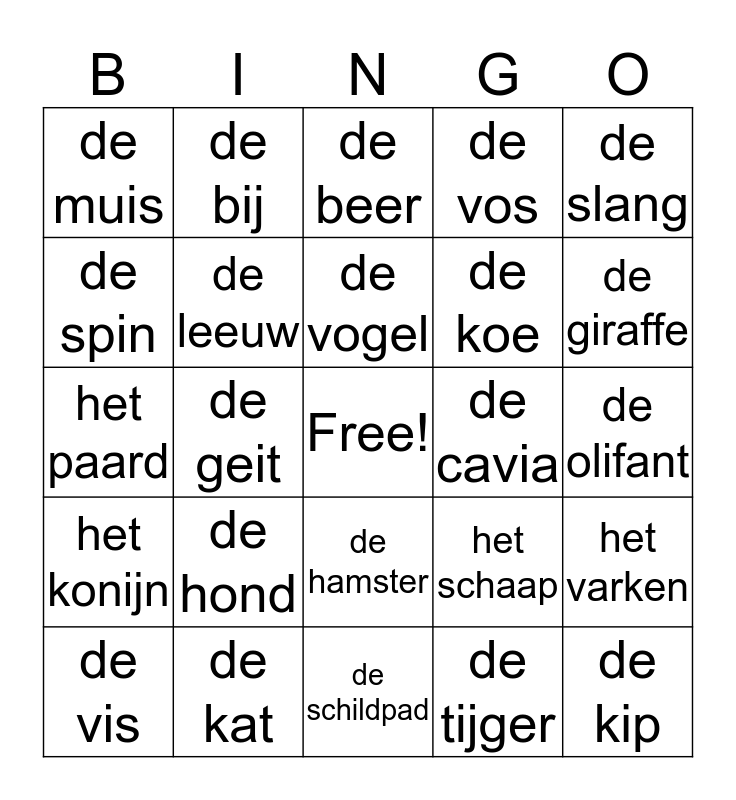 This bingo card has a free space and 24 words: de hond, de kat, de vogel, de vis, de slang, de muis, de spin, de bij, de cavia, de hamster, de koe, het paard, het schaap, het varken, de leeuw, de tijger, de olifant, de beer, de giraffe, de geit, de kip, het konijn, de vos and de schildpad.