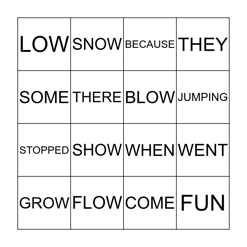 This bingo card has 16 words: FLOW, WENT, BECAUSE, LOW, STOPPED, SNOW, WHEN, COME, SOME, THERE, GROW, THEY, SHOW, JUMPING, BLOW and FUN.