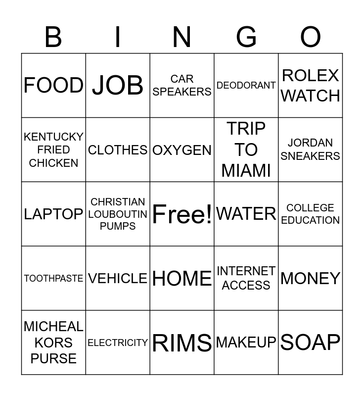 This bingo card has a free space and 24 words: VEHICLE, ELECTRICITY, OXYGEN, MICHEAL KORS PURSE, ROLEX WATCH, FOOD, KENTUCKY FRIED CHICKEN, JOB, WATER, HOME, TRIP TO MIAMI, LAPTOP, INTERNET ACCESS, MONEY, CLOTHES, MAKEUP, COLLEGE EDUCATION, CAR SPEAKERS, JORDAN SNEAKERS, CHRISTIAN LOUBOUTIN PUMPS, SOAP, TOOTHPASTE, DEODORANT and RIMS.