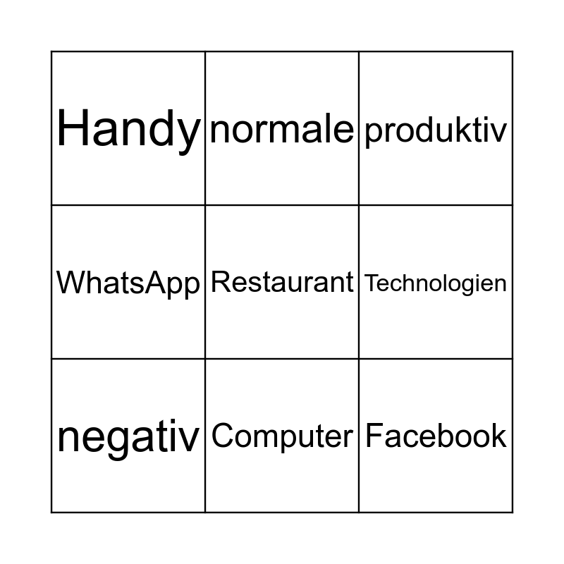 This bingo card has 12 words: Internetnutzern, Facebook, Restaurant, Technologien, normale, produktiv, Computer, Veränderungen, Handy, WhatsApp, negativ and Daten.