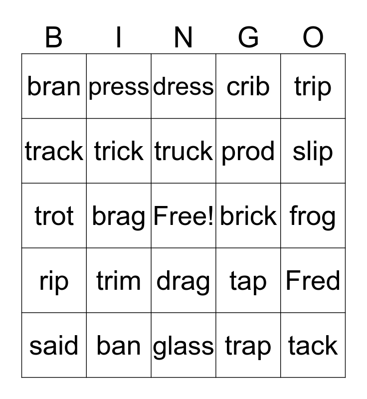This bingo card has a free space and 24 words: trim, ban, truck, said, trip, bran, track, press, brick, drag, prod, trot, tap, Fred, trick, trap, frog, dress, slip, brag, tack, rip, crib and glass.