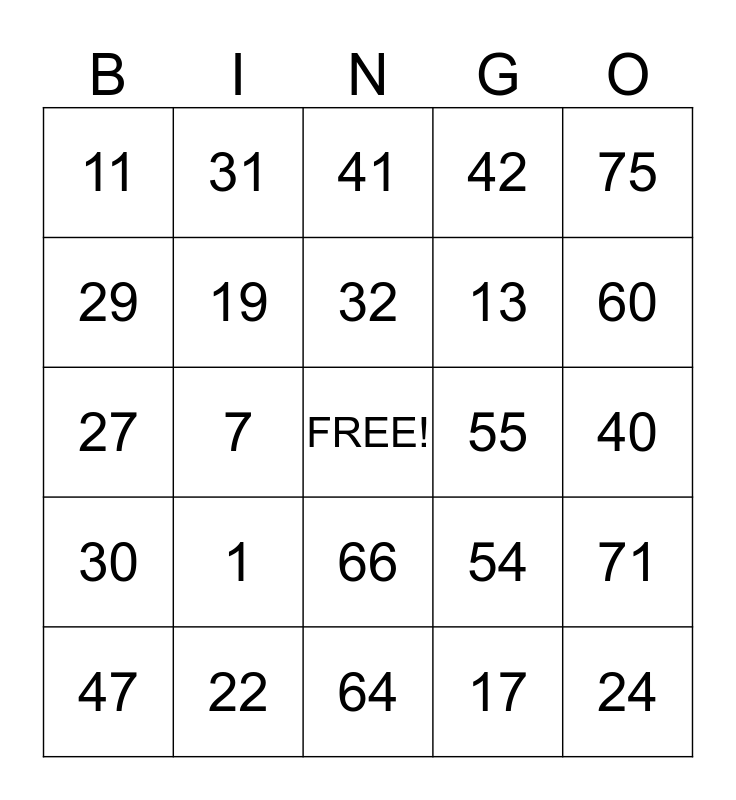 This bingo card has a free space and 24 words: 1, 22, 32, 47, 75, 11, 29, 31, 55, 66, 13, 27, 54, 71, 19, 17, 40, 41, 60, 7, 24, 30, 42 and 64.