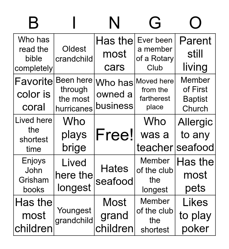 This bingo card has a free space and 24 words: Lived here the longest, Youngest grandchild, Who has owned a business, Has the most children, Parent still living, Who has read the bible completely, Favorite color is coral, Oldest crandchild, Who was a teacher, Hates seafood, Moved here from the fartherest place, Lived here the shortest time, Member of the club the longest, Has the most pets, Been here through the most hurricanes, Member of the club the shortest, Allergic to any seafood, Has the most cars, Member of First Baptist Church, Who plays brige, Likes to play poker, Enjoys John Grisham books, Ever been a member of a Rotary Club and Most grand children.
