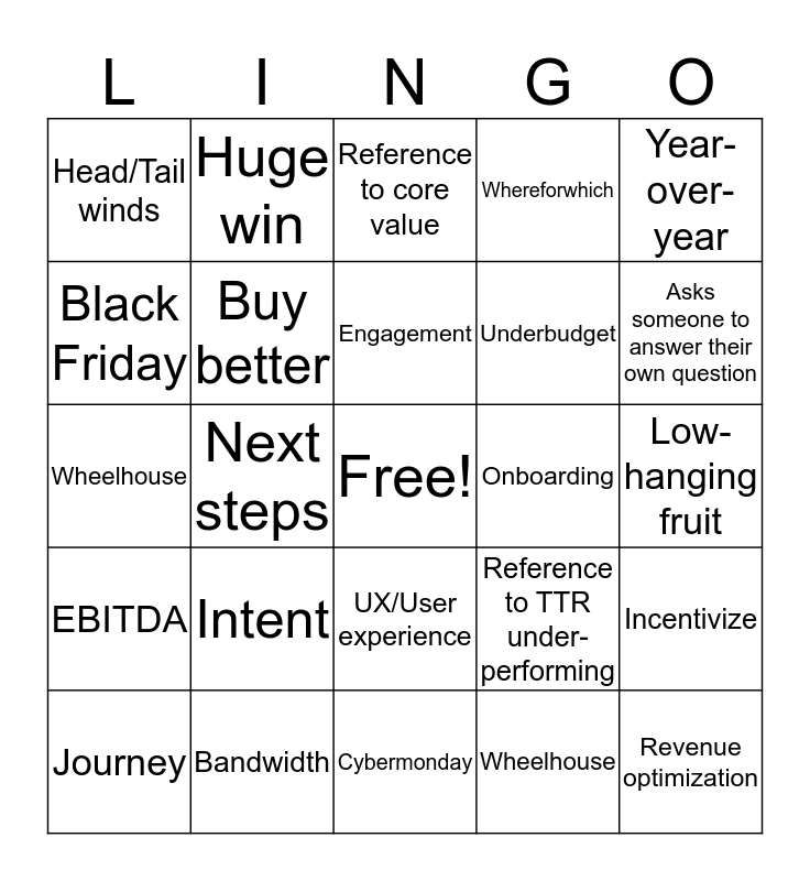 This bingo card has a free space and 39 words: Nacente, Verticals, Metrics, Buy better, Journey, UX/User experience, Engagement, Decision enablement, Year-over-year, EBITDA, Next steps, Whereforwhich, Revenue optimization, Low-hanging fruit, Onboarding, Intent, Implement, Head/Tail winds, Leverage, Reference to TTR under-performing, Black Friday, Cybermonday, Underbudget, Asks someone to answer their own question, Prodding us to ask hard questions, Scaling up/down, Outperforming in a difficult space, Milestones, Portfolio of brands, Huge win, Thinking outside the box, Disruption, Reference to core value, Bandwidth, Wheelhouse, Core competency, Incentivize, Wheelhouse and Wherebywhich.