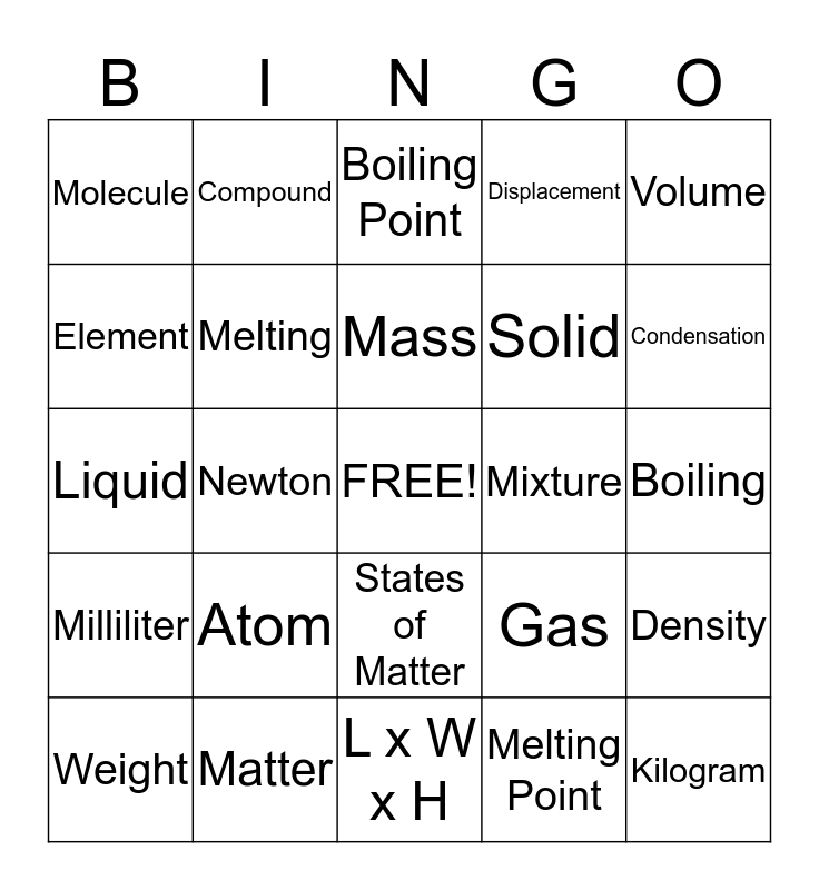 This bingo card has a free space and 24 words: Atom, Matter, Mass, Weight, Volume, Molecule, Element, Compound, Mixture, States of Matter, Solid, Liquid, Gas, Density, Melting, Melting Point, Boiling, Boiling Point, Condensation, Newton, Kilogram, Milliliter, Displacement and L x W x H.