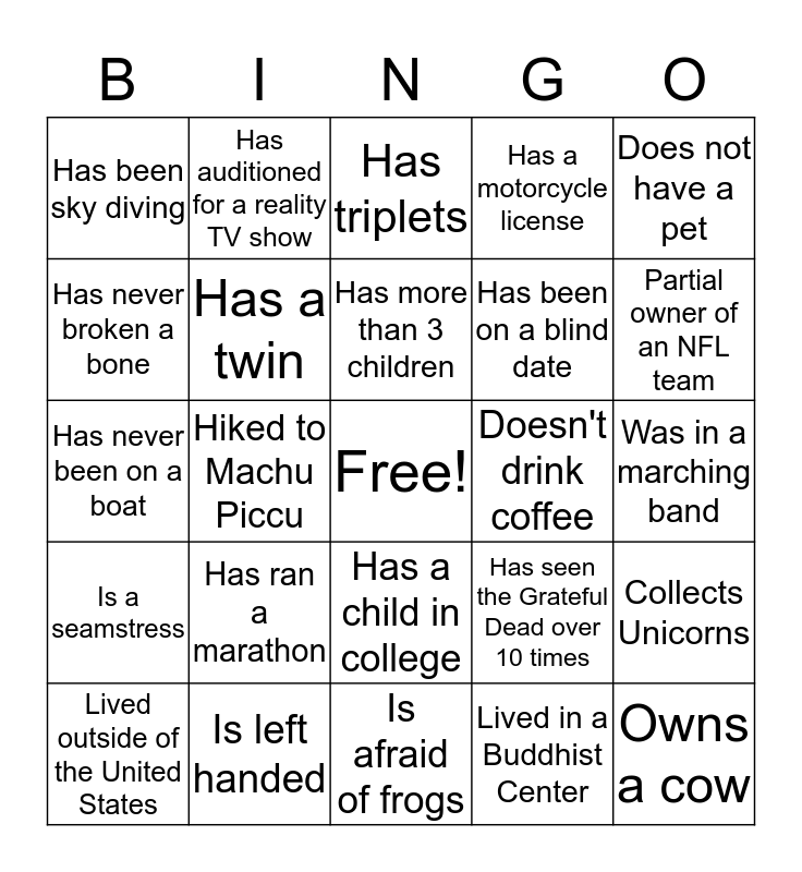 This bingo card has a free space and 24 words: Has ran a marathon, Is left handed, Has more than 3 children, Lived outside of the United States, Does not have a pet, Has been sky diving, Has never broken a bone, Has auditioned for a reality TV show, Doesn't drink coffee, Has a child in college, Has been on a blind date, Has never been on a boat, Has seen the Grateful Dead over 10 times, Collects Unicorns, Has a twin, Lived in a Buddhist Center, Was in a marching band, Has triplets, Partial owner of an NFL team, Hiked to Machu Piccu, Owns a cow, Is a seamstress, Has a motorcycle license and Is afraid of frogs.