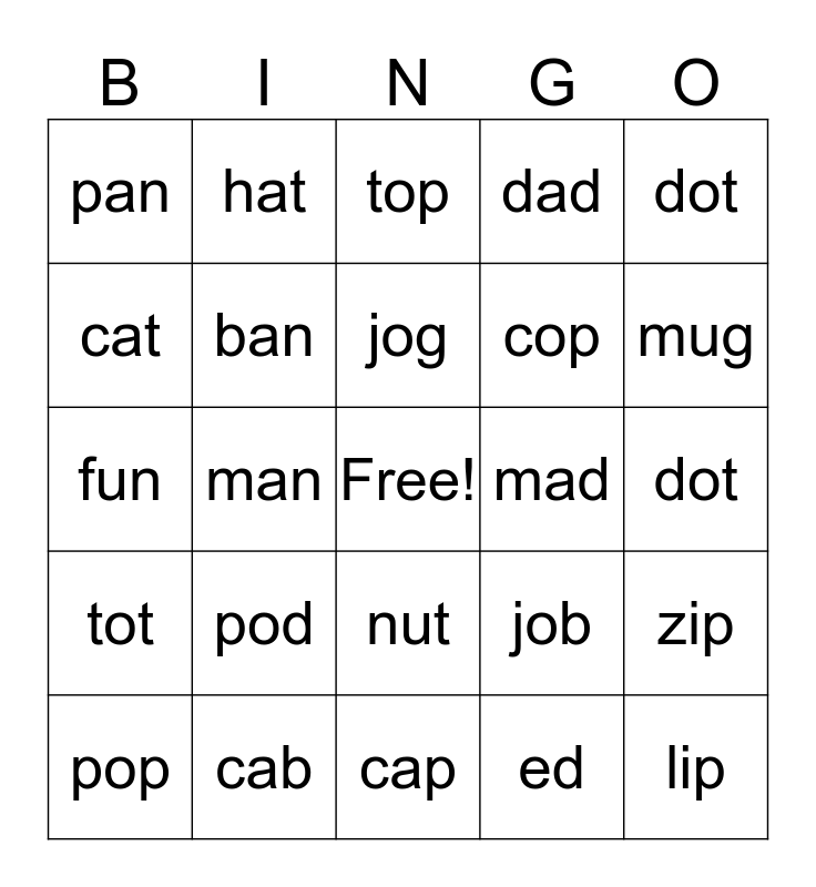 This bingo card has a free space and 26 words: nut, ed, jog, cab, dot, pan, cat, hat, dot, job, cop, fun, zip, pop, man, map, dad, tot, top, lip, mug, cap, mad, pod, ban and dab.