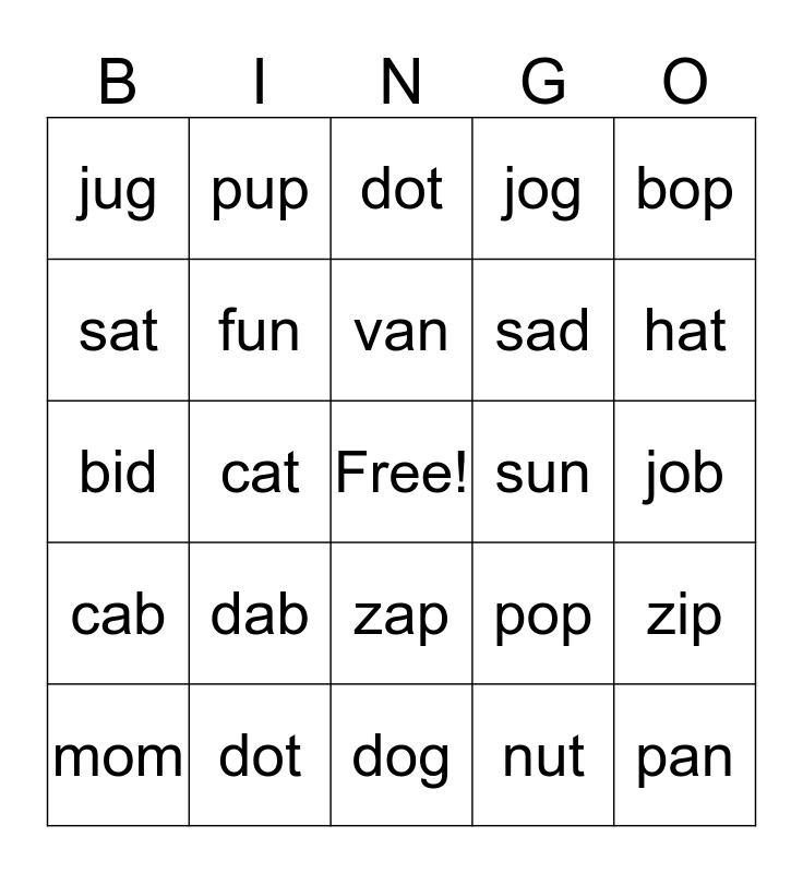 This bingo card has a free space and 25 words: dab, dog, van, mom, bop, jug, sat, pup, sun, zap, sad, bid, pop, zip, fun, cop, job, dot, hat, cat, pan, dot, cab, jog and nut.