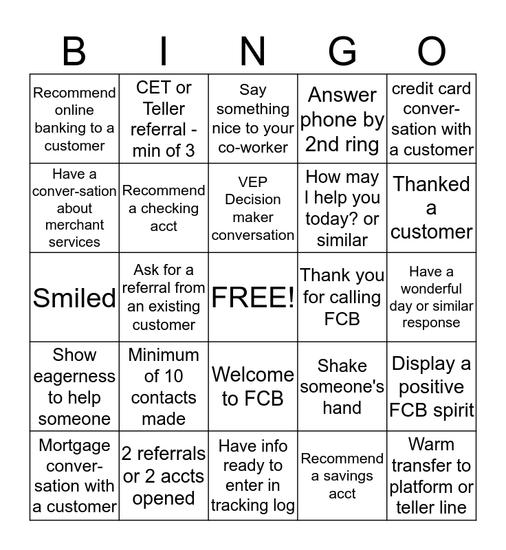 This bingo card has a free space and 24 words: Minimum of 10 contacts made, 2 referrals or 2 accts opened, VEP Decision maker conversation, Mortgage conver-sation with a customer, credit card conver-sation with a customer, Recommend online banking to a customer, Have a conver-sation about merchant services, CET or Teller referral - min of 3, Thank you for calling FCB, Welcome to FCB, How may I help you today? or similar, Smiled, Shake someone's hand, Display a positive FCB spirit, Recommend a checking acct, Recommend a savings acct, Have a wonderful day or similar response, Say something nice to your co-worker, Thanked a customer, Ask for a referral from an existing customer, Warm transfer to platform or teller line, Show eagerness to help someone, Answer phone by 2nd ring and Have info ready to enter in tracking log.