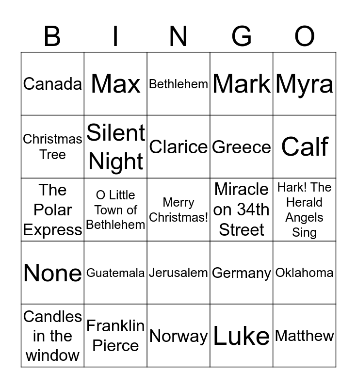 This bingo card has a free space and 51 words: O Come, All Ye Faithful, Matthew, Alabama, Norway, Guatemala, Francis, Max, Home Alone 2, Christmas Tree, Las Posadas, Silent Night, Mark, Oklahoma, Germany, Montgomery Ward, Stephen, Clarice, Miracle on 34th Street, Mistletoe, Myra, O Little Town of Bethlehem, Luke, Canada, Greece, Macy's, Pope Julius I, Calf, It's a Wonderful Life, Candles in the window, Bethlehem, The First Noel, John, Italy, Poland, A spider’s web, Franklin Pierce, Ox and Lamb, A Charlie Brown Christmas, In a house, Rudolph, Hark! The Herald Angels Sing, None, Finland, Iceland, Lucy, Teddy Roosevelt, The Polar Express, How the Grinch Stole Christmas, In a manger, Jerusalem and Jesse Tree.