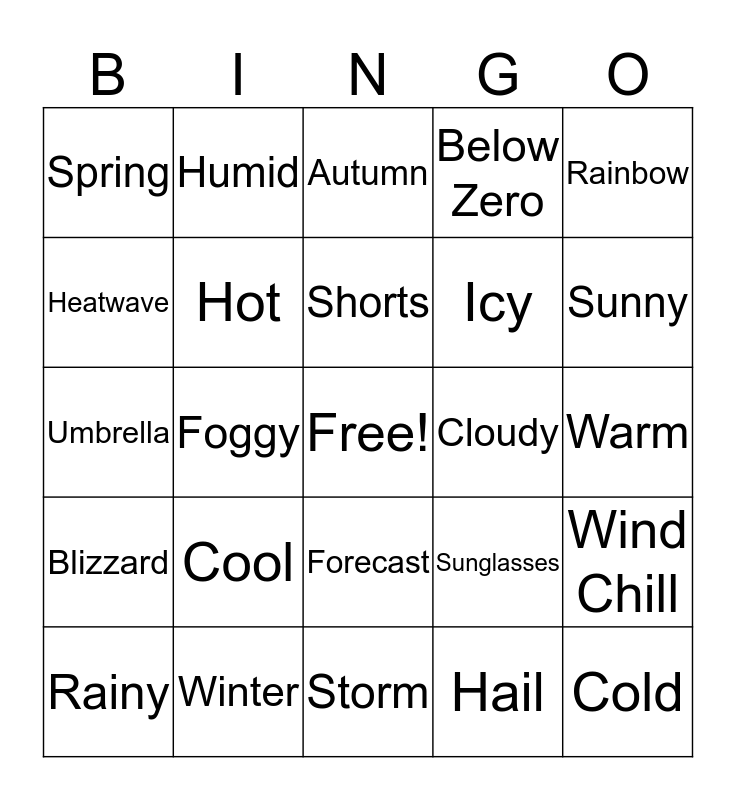 This bingo card has a free space and 29 words: Rainy, Snowy, Foggy, Summer, Spring, Autumn, Hot, Cool, Cloudy, Winter, Warm, Cold, Storm, Hail, Sunny, Windy, Forecast, Blizzard, Rainbow, Umbrella, Sunglasses, Lightning, Icy, Heatwave, Below Zero, Humid, Wind Chill, Shorts and Sandals.