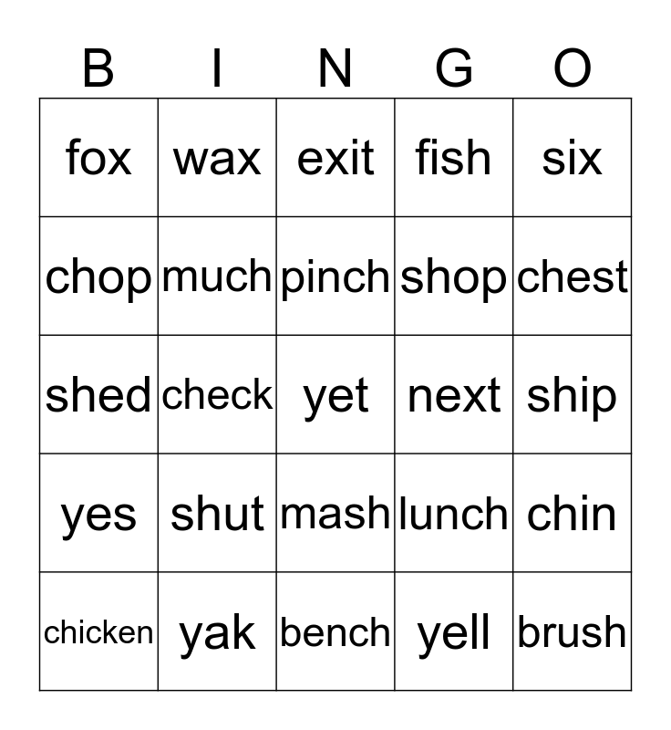 This bingo card has 25 words: yes, yak, yet, yell, six, fox, wax, exit, next, chin, chop, much, bench, lunch, chest, chicken, check, pinch, shop, ship, shed, shut, mash, fish and brush.