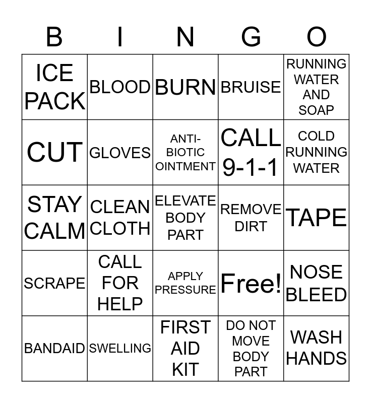 This bingo card has 25 words: CALL FOR HELP, FIRST AID KIT, ANTI-BIOTIC OINTMENT, BANDAID, RUNNING WATER AND SOAP, ICE PACK, CUT, BLOOD, REMOVE DIRT, APPLY PRESSURE, CALL 9-1-1, STAY CALM, Free!, NOSE BLEED, GLOVES, WASH HANDS, TAPE, BURN, COLD RUNNING WATER, CLEAN CLOTH, ELEVATE BODY PART, SWELLING, SCRAPE, BRUISE and DO NOT MOVE BODY PART.