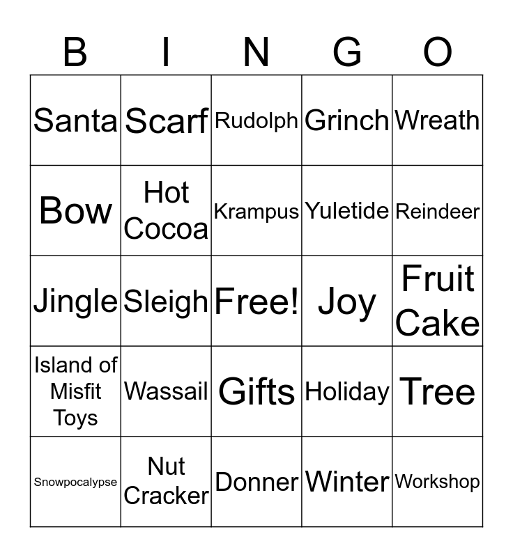 This bingo card has a free space and 100 words: Celebrate, Chimney, Fruit Cake, Goodwill, Icicles, Fireplace, North pole, Parades, Ribbons, Scrooge, St Nick, Stockings, Tinsel, Nut Cracker, Bells, Cards, Yuletide, Star, Lights, New Years Eve, Chestnuts, Caroling, Gingerbread, Wish, Holly, Joy, Wreath, Holiday, Cheer, Snow, Sleigh, Santa, Cookies, Elf, Winter, Krampus, Tree, Festive, Snowflake, Eggnog, Gift, Presents, Jingle, Frosty, Reindeer, Rudolph, Dasher, Dancer, Prancer, Donner, Blizen, Comet, Cupid, Vixen, Mistletoe, Ornament, Poinsettia, Toys, Merry, Grinch, Candles, Candy Cane, Peace, Decorations, Tiny Tim, Sugar Plums, Sleigh bells, Sled, Charity, Giving, Shopping, Wassail, Cindy Lou Who, Twinkling, Wrapping Paper, Pinecone, Garland, Bow, Ice, Glitter, Figgy Pudding, Workshop, Mincemeat, Gifts, Cranberries, Scarf, Baubles, Heat Miser, Cold Miser, Island of Misfit Toys, Jack Frost, Home Alone, Chalet, Snowpocalypse, Hot Cocoa, Icicles, Blizzard, Toboggan, Gloves and Hat.