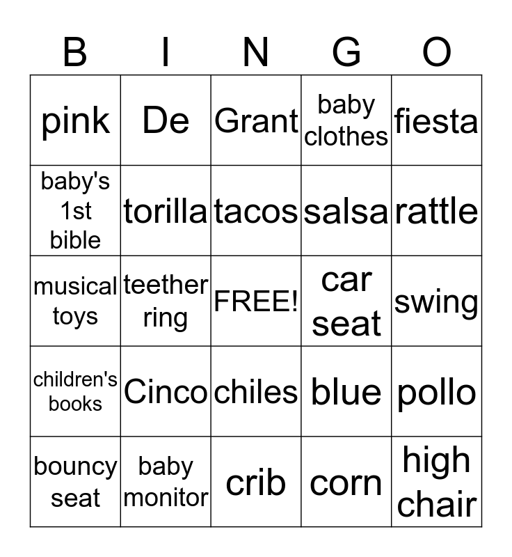 This bingo card has a free space and 24 words: Cinco, baby monitor, tacos, bouncy seat, fiesta, pink, baby's 1st bible, De, car seat, chiles, salsa, musical toys, blue, pollo, torilla, corn, swing, Grant, rattle, teether ring, high chair, children's books, baby clothes and crib.