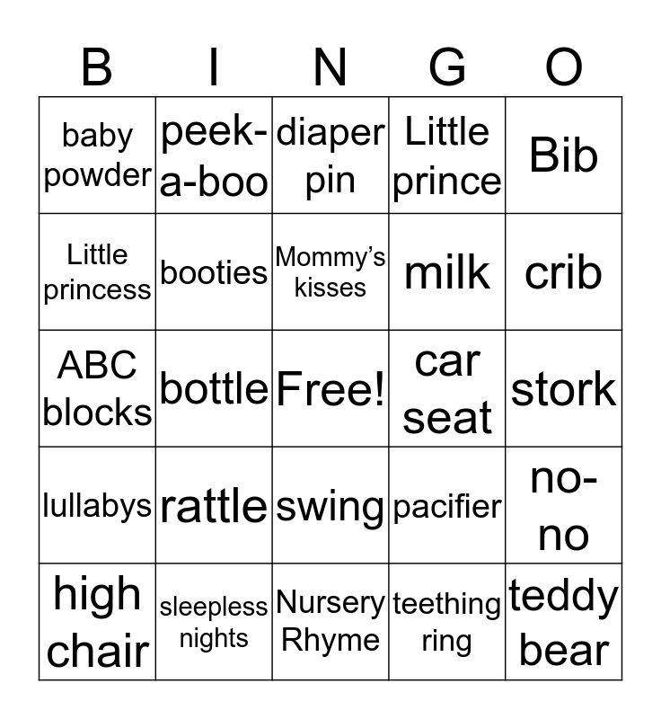 This bingo card has a free space and 31 words: Nursery Rhyme, Stroller, bottle, blanket, baby powder, diaper pin, booties, pacifier, car seat, teething ring, stork, teddy bear, free space, diaper bag, crib, formula, no-no, rattle, lullabys, swing, Bib, diapers, high chair, peek-a-boo, milk, Little princess, Little prince, ABC blocks, sleepless nights, Mommy’s kisses and Grandma’s hugs.