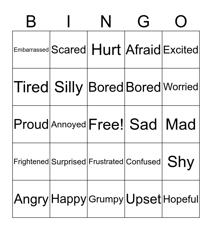 This bingo card has a free space and 24 words: Surprised, Happy, Bored, Angry, Excited, Embarrassed, Tired, Scared, Sad, Frustrated, Bored, Proud, Confused, Shy, Silly, Upset, Mad, Hurt, Worried, Annoyed, Hopeful, Frightened, Afraid and Grumpy.