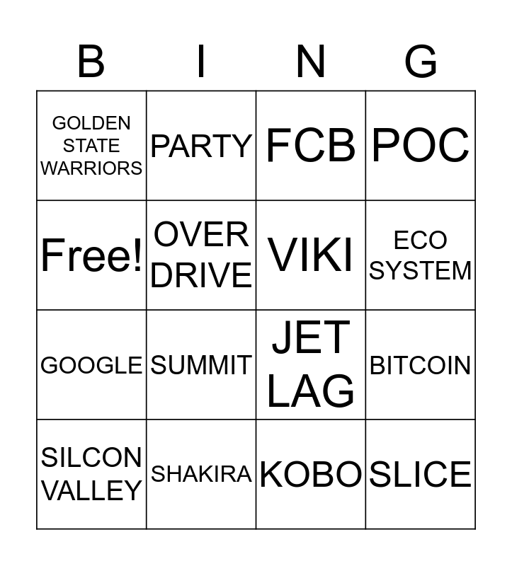 This bingo card has 16 words: SHAKIRA, BITCOIN, FCB, GOLDEN STATE WARRIORS, GOOGLE, PARTY, JET LAG, KOBO, Free!, OVER DRIVE, SILCON VALLEY, POC, SUMMIT, ECO SYSTEM, VIKI and SLICE.