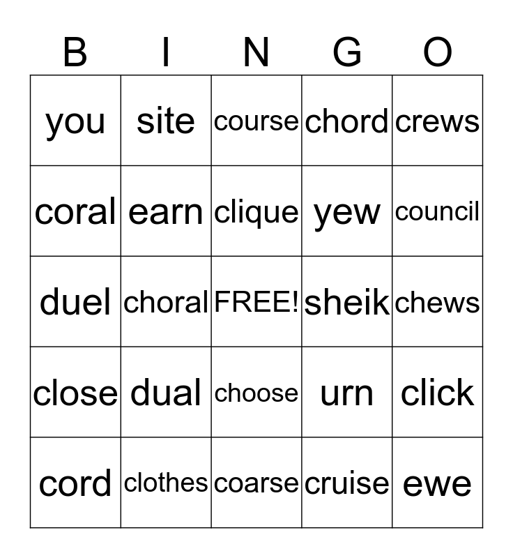 This bingo card has a free space and 24 words: dual, clothes, clique, cord, crews, you, coral, site, sheik, choose, yew, duel, urn, click, earn, cruise, chews, course, council, choral, ewe, close, chord and coarse.