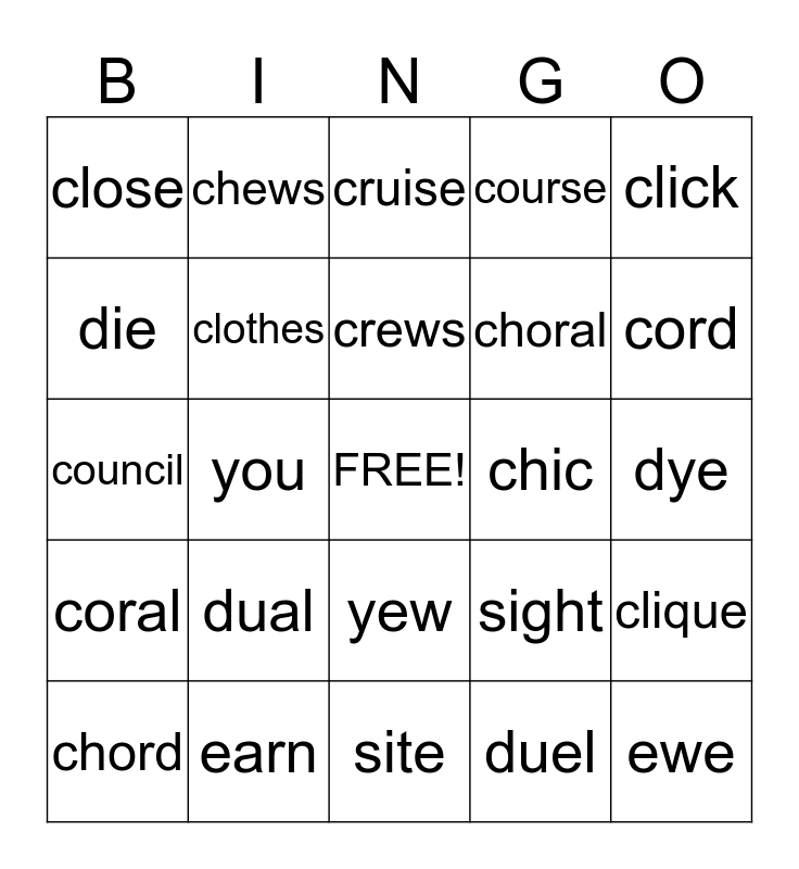 This bingo card has a free space and 24 words: dual, earn, crews, chord, click, close, die, chews, chic, yew, choral, council, sight, clique, clothes, duel, dye, cruise, cord, you, ewe, coral, course and site.