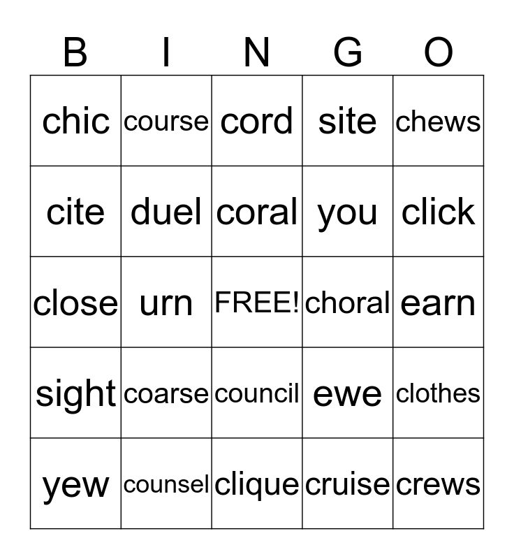 This bingo card has a free space and 24 words: coarse, counsel, coral, yew, chews, chic, cite, course, choral, council, you, close, ewe, clothes, duel, cruise, earn, cord, click, urn, crews, sight, site and clique.