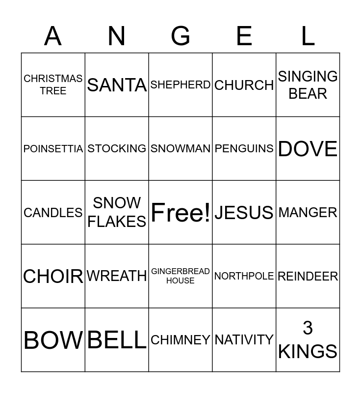 This bingo card has a free space and 24 words: WREATH, BELL, SNOWMAN, BOW, SINGING BEAR, CHRISTMAS TREE, POINSETTIA, SANTA, JESUS, GINGERBREAD HOUSE, PENGUINS, CANDLES, NORTHPOLE, REINDEER, STOCKING, NATIVITY, MANGER, SHEPHERD, DOVE, SNOW FLAKES, 3 KINGS, CHOIR, CHURCH and CHIMNEY.
