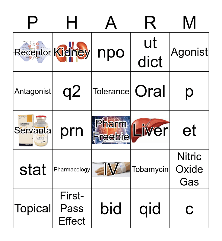 This bingo card has 5 images, a free space and 24 words: Pharmacology, First-Pass Effect, Tolerance, Topical, Agonist, Receptor, Antagonist, Kidney, Liver, IV, Oral, Servanta, Tobamycin, Nitric Oxide Gas, q2, qid, et, npo, p, prn, c, stat, ut dict and bid.