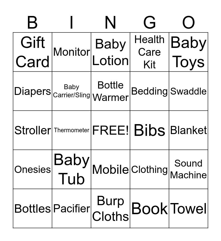 This bingo card has a free space and 24 words: Baby Tub, Pacifier, Bottle Warmer, Bottles, Baby Toys, Gift Card, Diapers, Monitor, Bibs, Mobile, Bedding, Stroller, Clothing, Sound Machine, Baby Carrier/Sling, Book, Blanket, Baby Lotion, Swaddle, Thermometer, Towel, Onesies, Health Care Kit and Burp Cloths.