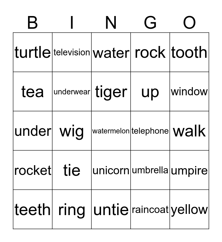 This bingo card has 25 words: tie, untie, tiger, teeth, tooth, turtle, tea, television, telephone, unicorn, up, under, umbrella, umpire, underwear, yellow, walk, water, window, wig, watermelon, ring, rocket, rock and raincoat.