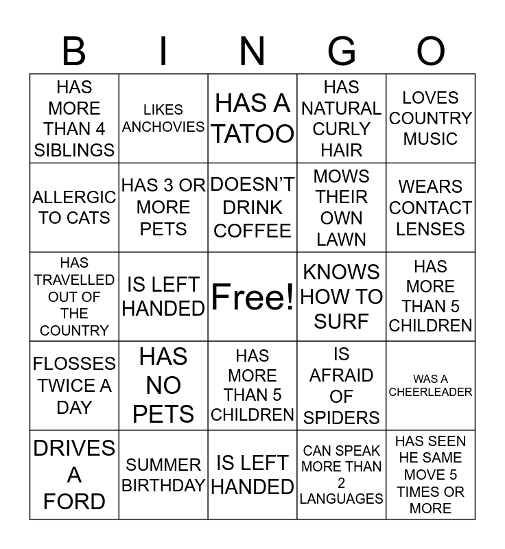 This bingo card has a free space and 24 words: DRIVES A FORD, HAS NO PETS, DOESN’T DRINK COFFEE, CAN SPEAK MORE THAN 2 LANGUAGES, LOVES COUNTRY MUSIC, HAS MORE THAN 4 SIBLINGS, LIKES ANCHOVIES, HAS A TATOO, KNOWS HOW TO SURF, HAS MORE THAN 5 CHILDREN, HAS TRAVELLED OUT OF THE COUNTRY, HAS 3 OR MORE PETS, IS AFRAID OF SPIDERS, WAS A CHEERLEADER, ALLERGIC TO CATS, SUMMER BIRTHDAY, IS LEFT HANDED, HAS NATURAL CURLY HAIR, WEARS CONTACT LENSES, FLOSSES TWICE A DAY, IS LEFT HANDED, HAS MORE THAN 5 CHILDREN, MOWS THEIR OWN LAWN and HAS SEEN HE SAME MOVE 5 TIMES OR MORE.