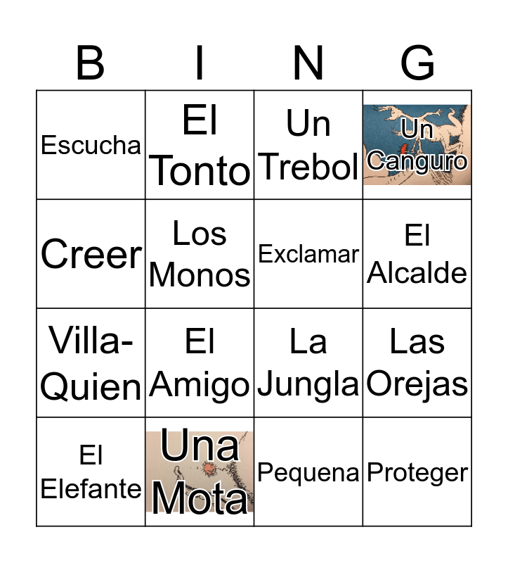 This bingo card has 2 images and 16 words: El Elefante, Una Mota, Un Trebol, Un Canguro, Creer, El Tonto, La Jungla, Las Orejas, Escucha, Los Monos, Pequena, El Alcalde, Villa-Quien, El Amigo, Exclamar and Proteger.