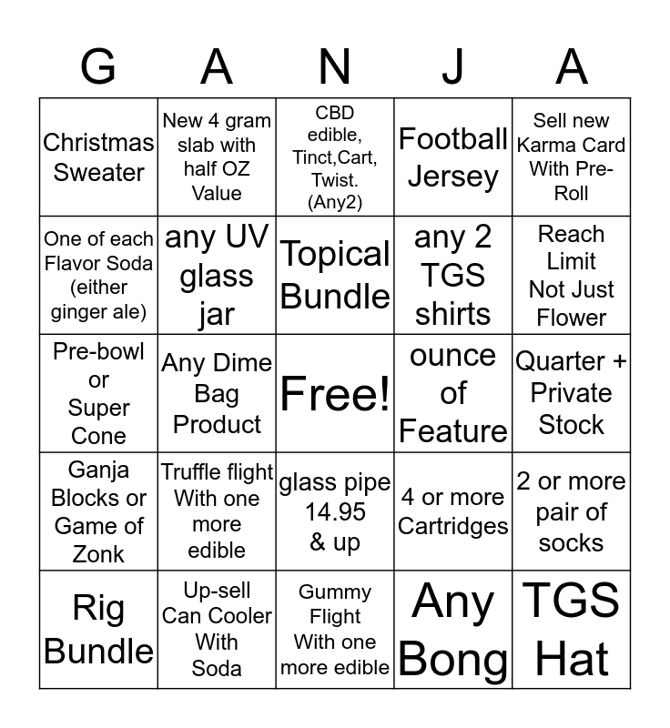 This bingo card has a free space and 24 words: Truffle flight With one more edible, Up-sell Can Cooler With Soda, Topical Bundle, Rig Bundle, Sell new Karma Card With Pre- Roll, Christmas Sweater, One of each Flavor Soda (either ginger ale), New 4 gram slab with half OZ Value, ounce of Feature, glass pipe 14.95 & up, any 2 TGS shirts, Pre-bowl or Super Cone, 4 or more Cartridges, 2 or more pair of socks, any UV glass jar, Any Bong, Quarter + Private Stock, CBD edible, Tinct,Cart, Twist. (Any2), Reach Limit Not Just Flower, Any Dime Bag Product, TGS Hat, Ganja Blocks or Game of Zonk, Football Jersey and Gummy Flight With one more edible.