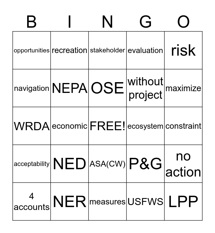 This bingo card has a free space and 24 words: NED, NER, OSE, 4 accounts, risk, opportunities, navigation, recreation, ecosystem, ASA(CW), without project, WRDA, P&G, no action, NEPA, USFWS, constraint, stakeholder, maximize, economic, LPP, acceptability, evaluation and measures.