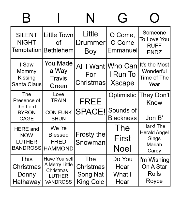 This bingo card has a free space and 24 words: We 're Blessed FRED HAMMOND, Have Yourself A Merry Little Christmas -LUTHER VANDROSS, All I Want For Christmas, This Christmas Donny Hathaway, Someone To Love You RUFF ENDZ, SILENT NIGHT Temptation, I Saw Mommy Kissing Santa Claus, Little Town of Bethlehem, Optimistic Sounds of Blackness, Frosty the Snowman, Who Can I Run To Xscape, The Presence of the Lord BYRON CAGE, The First Noel, Hark! The Herald Angel Sings Mariah Carey, You Made a Way Travis Green, Do You Hear What I Hear, They Don't Know Jon B', Little Drummer Boy, It’s the Most Wonderful Time of The Year, Love TRAIN CON FUNK SHUN, I'm Wishing On A Star Rolls Royce, HERE and NOW LUTHER BANDROSS, O Come, O Come Emmanuel and The Christmas Song Nat King Cole.