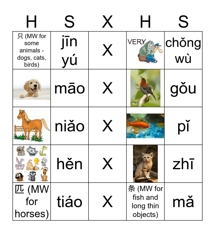 This bingo card has 7 images and 18 words: tiáo, X, 条 (MW for fish and long thin objects), chǒng wù, 只 (MW for some animals - dogs, cats, birds), jīn yú, X, zhī, māo, X, gǒu, 匹 (MW for horses), niǎo, X, pǐ, hěn, X and mǎ.