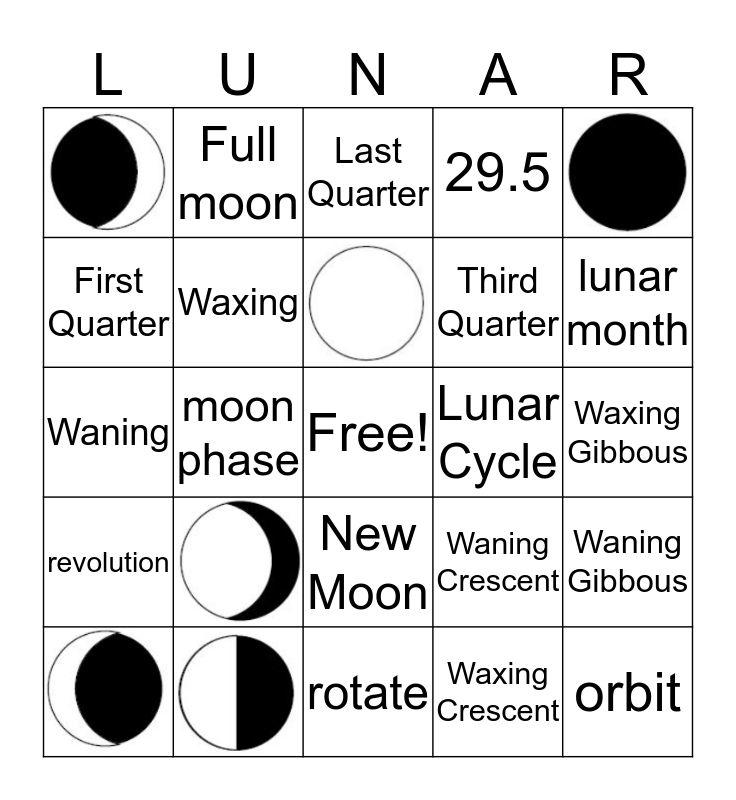 This bingo card has 6 images, a free space and 18 words: First Quarter, Full moon, Lunar Cycle, New Moon, Third Quarter, Waning, Waning Crescent, Waning Gibbous, Waxing, Waxing Crescent, Waxing Gibbous, Last Quarter, lunar month, moon phase, orbit, revolution, 29.5 and rotate.