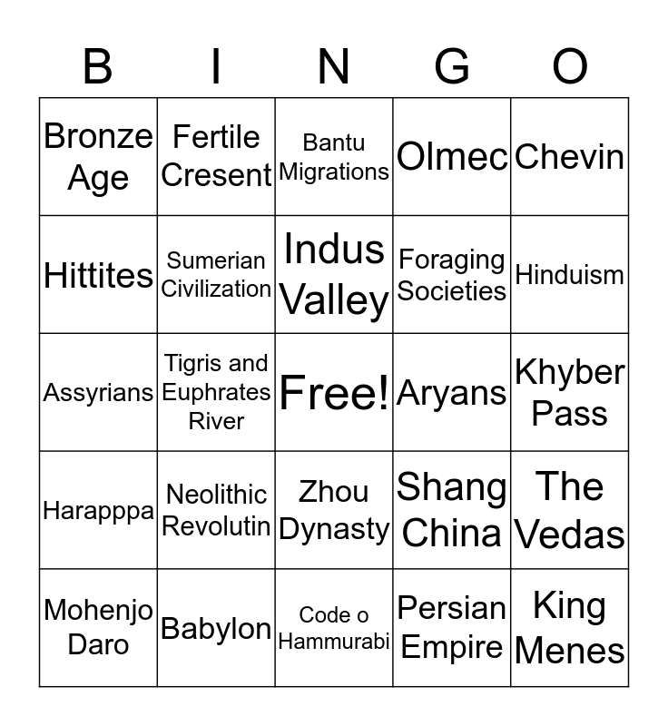 This bingo card has a free space and 24 words: Neolithic Revolutin, Babylon, Indus Valley, Mohenjo Daro, Chevin, Bronze Age, Hittites, Fertile Cresent, Aryans, Zhou Dynasty, Foraging Societies, Assyrians, Shang China, The Vedas, Sumerian Civilization, Persian Empire, Khyber Pass, Bantu Migrations, Hinduism, Tigris and Euphrates River, King Menes, Harapppa, Olmec and Code o Hammurabi.