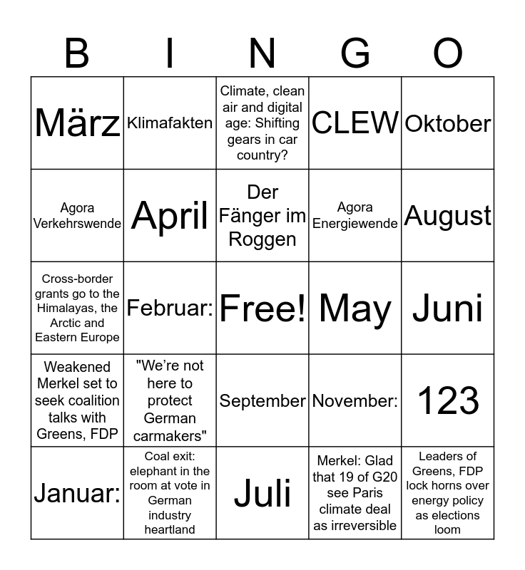This bingo card has a free space and 29 words: Januar:, Mehr Extremwetterereignisse: "Ja, das ist der Klimawandel", Februar:, Stuttgart to ban diesel cars when air is bad/ RWE writes down billions, März, Climate, clean air and digital age: Shifting gears in car country?, April, "We’re not here to protect German carmakers", May, Coal exit: elephant in the room at vote in German industry heartland, Juni, Leaders of Greens, FDP lock horns over energy policy as elections loom, Juli, Merkel: Glad that 19 of G20 see Paris climate deal as irreversible, August, 'Mini-consensus' at diesel summit/ Emissions may rise 2017 -think tank, September, Weakened Merkel set to seek coalition talks with Greens, FDP, Oktober, Cross-border grants go to the Himalayas, the Arctic and Eastern Europe, November:, German coalition talks collapse despite progress on climate and energy, Agora Energiewende, Agora Verkehrswende, CLEW, Klimafakten, 123, Der Fänger im Roggen and askdhjr.