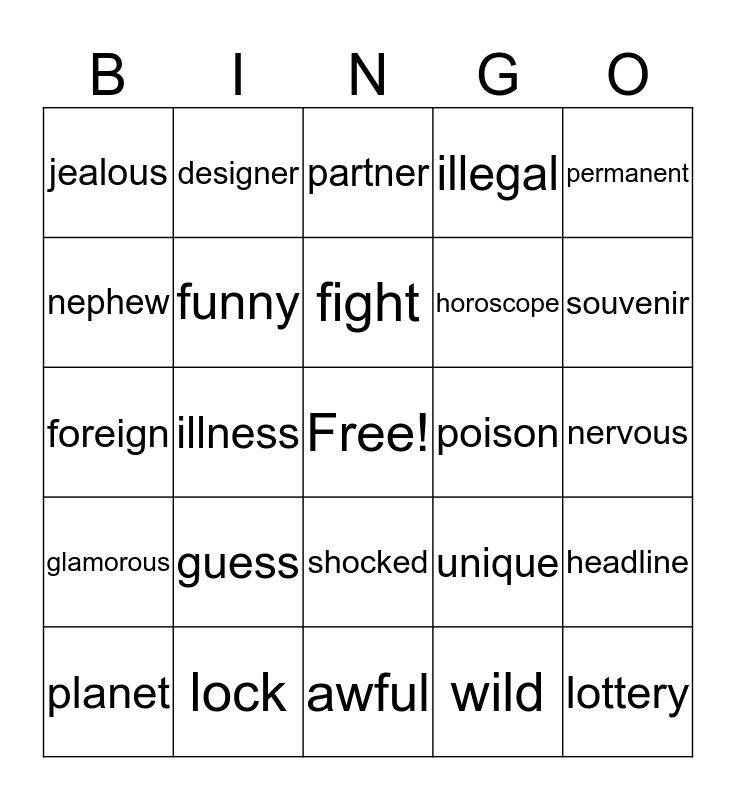 This bingo card has a free space and 104 words: advice, adventure, awful, accent, accident, brave, boss, busy, breathe, bowl, conference, comfortable, casual, coast, conversation, diamond, designer, downstairs, documentary, dozen, exchange, European, exit, exam, emergency, foreign, funny, fight, frightening, fantasy, glamorous, guess, gang, grandchild, goal, hairstyle, headache, hobby, horoscope, headline, ignore, illness, install, illegal, insurance, jealous, jewellry, link, loser, lottery, luxury, lock, match, meal, memory, moon, murder, nanny, nightmare, nervous, nephew, niece, owl, oven, owner, old, fashioned, partner, poison, permanent, planet, permission, qualifications, quiz, queue, reception, recommend, relationship, romantic, request, satellite, scream, shocked, sightseeing, souvenir, thief, tip, truth, trip, tidy, urgent, unemployment, underground, unique, vacuum, cleaner, vase, vet, wild, wish, winner, wallpaper, yacht and yoga.