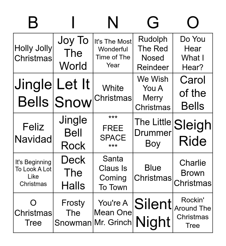 This bingo card has a free space and 24 words: Deck The Halls, Frosty The Snowman, White Christmas, O Christmas Tree, Do You Hear What I Hear?, Holly Jolly Christmas, Jingle Bells, Joy To The World, The Little Drummer Boy, Santa Claus Is Coming To Town, We Wish You A Merry Christmas, Feliz Navidad, Blue Christmas, Charlie Brown Christmas, Let It Snow, Silent Night, Sleigh Ride, It's The Most Wonderful Time of The Year, Carol of the Bells, Jingle Bell Rock, Rockin' Around The Christmas Tree, It's Beginning To Look A Lot Like Christmas, Rudolph The Red Nosed Reindeer and You're A Mean One Mr. Grinch.