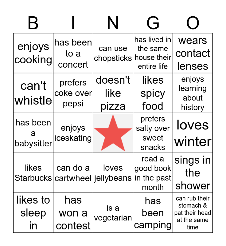 This bingo card has a free space and 24 words: can do a cartwheel, has won a contest, doesn't like pizza, likes to sleep in, wears contact lenses, enjoys cooking, can't whistle, has been to a concert, prefers salty over sweet snacks, loves jellybeans, likes spicy food, has been a babysitter, read a good book in the past month, sings in the shower, prefers coke over pepsi, has been camping, loves winter, can use chopsticks, enjoys learning about history, enjoys iceskating, can rub their stomach & pat their head at the same time, likes Starbucks, has lived in the same house their entire life and is a vegetarian.