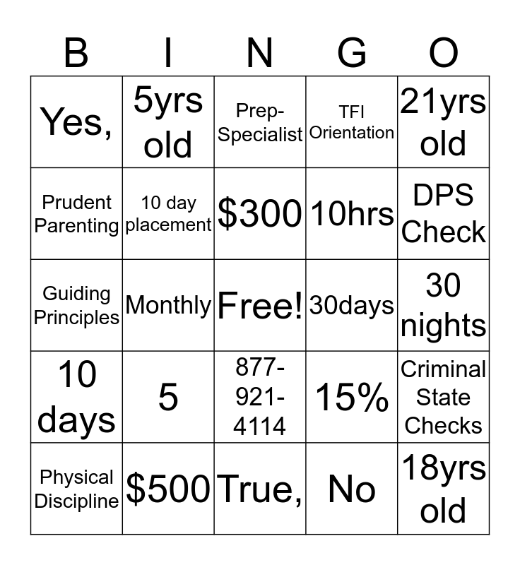 This bingo card has a free space and 31 words: True,, 1day,, Monthly, Military Criminal Check,, Yes,, Prep-Specialist, 10 day placement, 15%, 30days, No, 30 nights, 18yrs old, 12hrs, False, DPS Check, Child Welfare, Criminal State Checks, 5, 10 days, 877-921-4114, 21yrs old, 3yrs old, Physical Discipline, 5yrs old, 10hrs, Prudent Parenting, TFI Orientation, Guiding Principles, $500, $300 and Foster Care Worker.