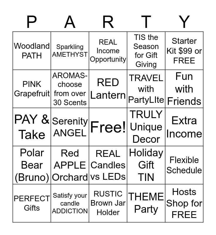 This bingo card has a free space and 24 words: PERFECT Gifts, Red APPLE Orchard, RED Lantern, THEME Party, Starter Kit $99 or FREE, Woodland PATH, Sparkling AMETHYST, REAL Income Opportunity, TRULY Unique Decor, Extra Income, PAY & Take, AROMAS- choose from over 30 Scents, Holiday Gift TIN, Flexible Schedule, PINK Grapefruit, Satisfy your candle ADDICTION, RUSTIC Brown Jar Holder, TIS the Season for Gift Giving, Fun with Friends, Polar Bear (Bruno), Serenity ANGEL, REAL Candles vs LEDs, TRAVEL with PartyLIte and Hosts Shop for FREE.