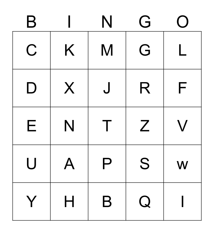 This bingo card has a free space and 24 words: A, H, J, Y, L, C, D, K, Z, P, R, E, S, w, X, Q, V, M, F, N, I, U, G and B.
