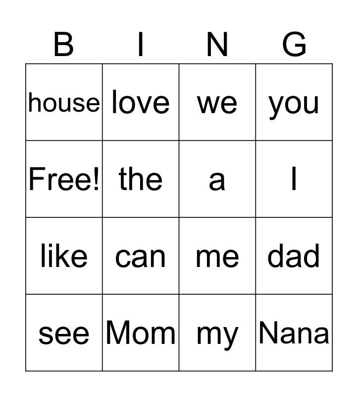 This bingo card has 16 words: Mom, dad, we, house, like, love, me, my, Free!, the, see, you, can, I, a and Nana.