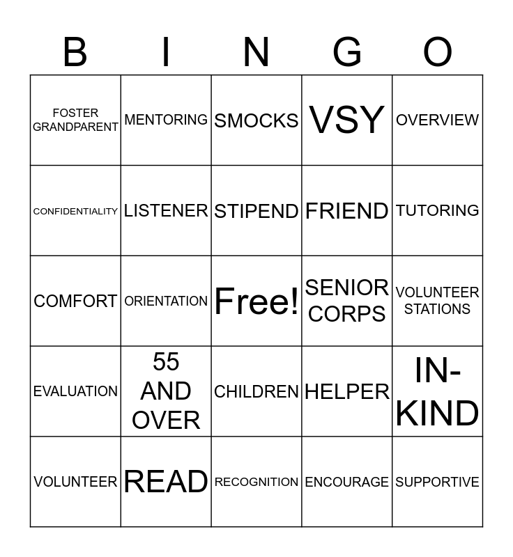 This bingo card has a free space and 24 words: 55 AND OVER, READ, STIPEND, VOLUNTEER, OVERVIEW, FOSTER GRANDPARENT, CONFIDENTIALITY, MENTORING, SENIOR CORPS, CHILDREN, FRIEND, COMFORT, HELPER, IN-KIND, LISTENER, ENCOURAGE, VOLUNTEER STATIONS, SMOCKS, TUTORING, ORIENTATION, SUPPORTIVE, EVALUATION, VSY and RECOGNITION.