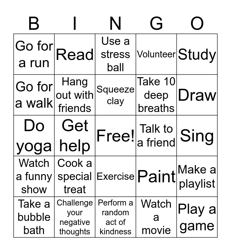 This bingo card has a free space and 24 words: Cook a special treat, Challenge your negative thoughts, Squeeze clay, Take a bubble bath, Study, Go for a run, Go for a walk, Read, Talk to a friend, Exercise, Take 10 deep breaths, Do yoga, Paint, Make a playlist, Hang out with friends, Watch a movie, Sing, Use a stress ball, Draw, Get help, Play a game, Watch a funny show, Volunteer and Perform a random act of kindness.